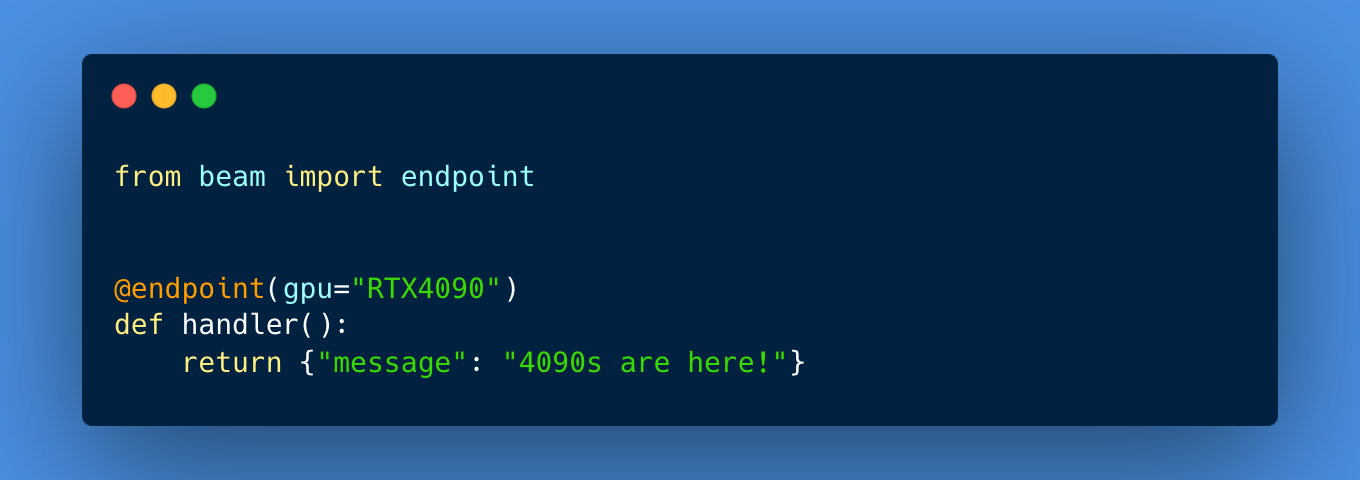 These are fantastic cards: they outperform A100s for many inference tasks and only cost $0.69. To use them, just addgpu="RTX4090"