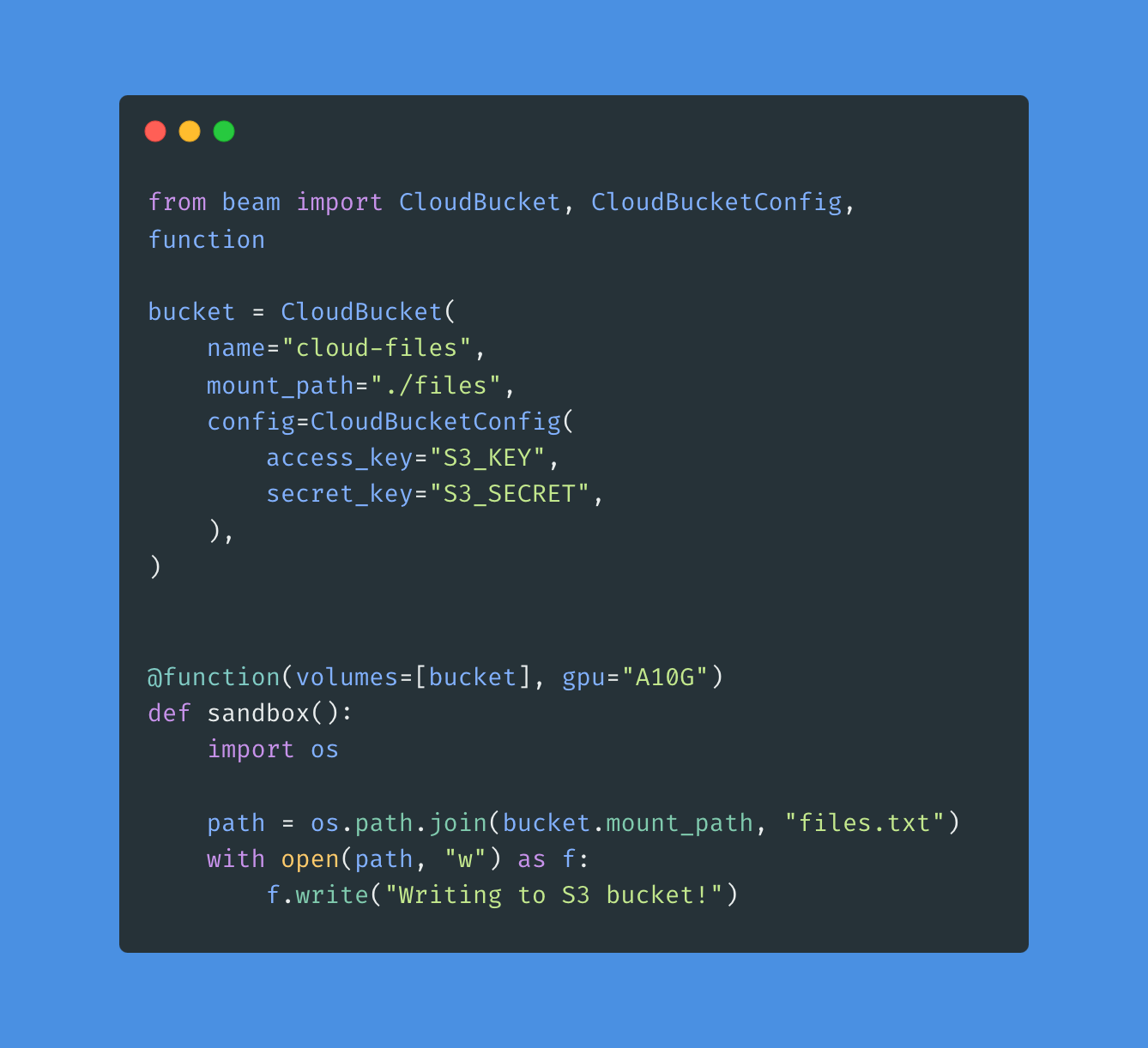You can now mount your own S3 buckets to your apps. Buckets are mounted using AWS’s mountpoint-s3. In general, any provider with an S3-compatible API should work. For instance, AWS S3, Cloudflare R2, and Tigris all work out of the box.